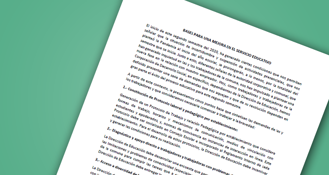 El inicio de este segundo semestre del 2020, ha generado ciertas condiciones que nos permiten señalar que la situación de incertidumbre y suspensión de actividades presenciales, que nos planteó la Pandemia al inicio del año escolar, se prolongarán, a lo menos, por la totalidad del semestre que se inicia. Junto a esto, diferentes señales de la autoridad corporativa y comunal, que han generado inquietud en las y los trabajadores de la comuna, nos han impulsado a plantear una nueva fase en la relación con nuestro empleador. Hoy, como trabajadores y trabajadoras de la Corporación de Desarrollo Social, en específico, dependientes de la Dirección de Educación, hemos definido presentar una serie de demandas que nos aquejan y que de su resolución dependen en gran parte el éxito del proceso educativo para este segundo semestre.