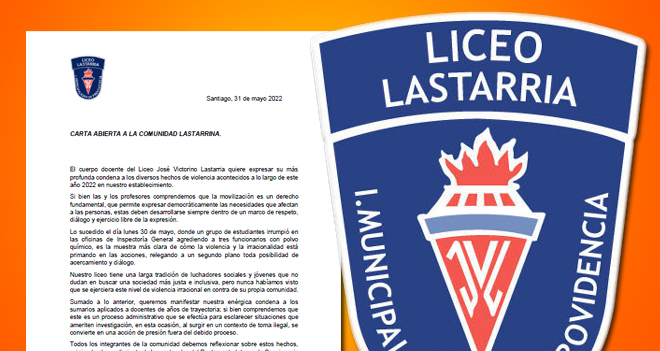 El cuerpo docente del Liceo José Victorino Lastarria quiere expresar su más profunda condena a los diversos hechos de violencia acontecidos a lo largo de este año 2022 en nuestro establecimiento.