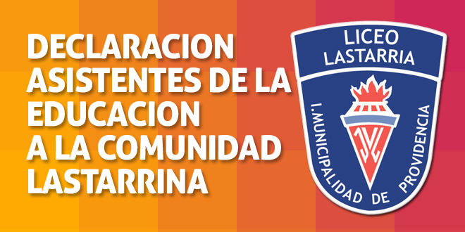 Leer más »DECLARACIÓN ASISTENTES DE LA EDUCACIÓN A LA COMUNIDAD EDUCATIVA DE PROVIDENCIA El estamento Asistente de la Educación del Liceo José Victorino Lastarria quiere expresar su más fuerte rechazo ante la serie de hechos de violencia que se han suscitado en estos primeros tres meses de iniciado el año escolar. Los …