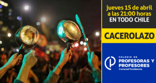 Este jueves 15 de abril, a las 21:00 horas en todo Chile… las profesoras y profesores caceroleamos porque… El gobierno debe resguardar la vida de las personas y protegerlas. No más bonos de miseria. El gobierno debe asegurar la conectividad de l@s estudiantes y docentes. Debe ponerse fin al agobio …