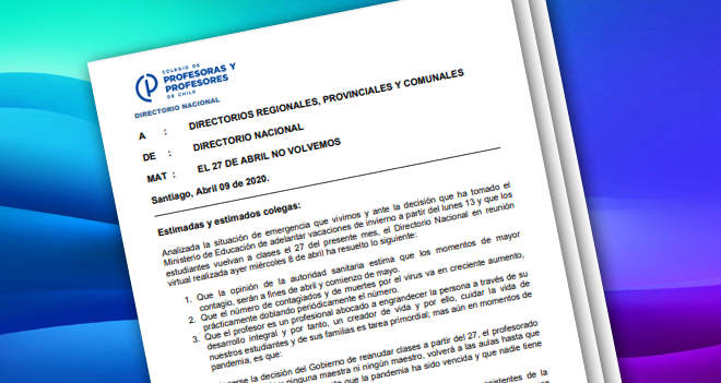De mantenerse la decisión del Gobierno de reanudar clases a partir del 27, el profesorado se opone a tal medida y ninguna maestra ni ningún maestro, volverá a las aulas hasta que la autoridad sanitaria diga oficialmente que la pandemia ha sido vencida y que nadie tiene peligro de contagio y de perder la vida.