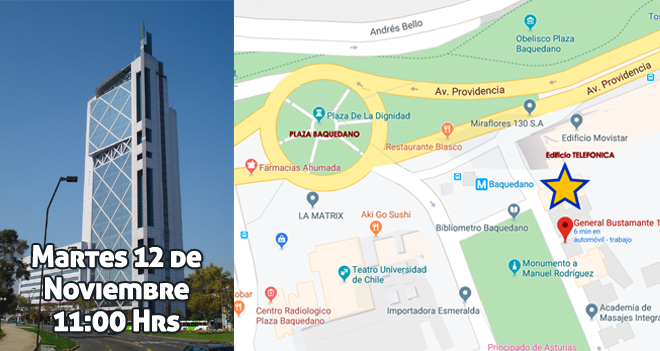 Les informamos que este martes 12 de noviembre nos sumamos a la gran Huelga General convocada para todos los chilenos. Para ello, nos reuniremos al costado del Edificio Telefónica (General Bustamante 18), a las 11:00 de la mañana, al costado de la salida Baquedano, de la línea 5.