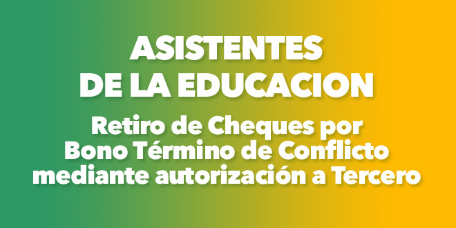 Junto con saludarles, informamos que los y las socias Asistentes de la Educación, y solo en casos estrictamente necesarios, que no puedan retirar su cheque por Bono de Término de Conflicto de manera personal en los días señalados, podrán autorizar a un tercero para realizar dicho retiro.